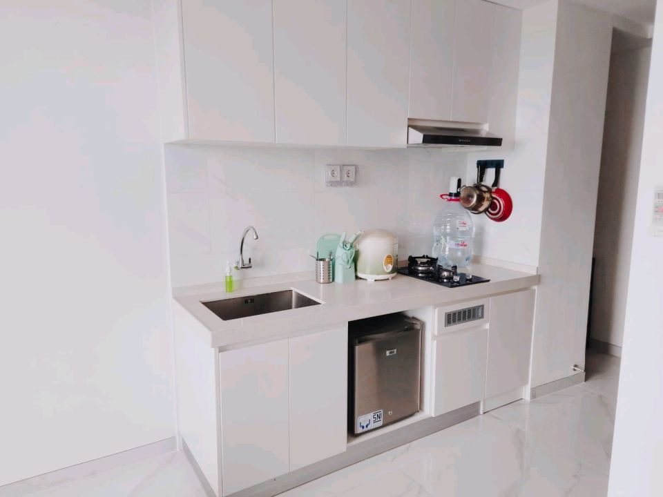 Kulkas, kitchen set, AC, water heater, intercom, smart lock system, bed, lemari baju, TV 32"