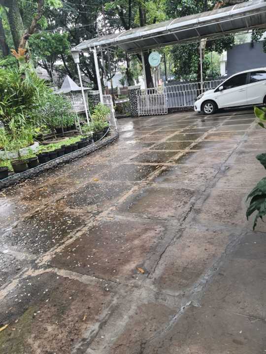 Garasi, carport dan halaman depan, total utk 7 mobil. Ada taman depan dan tengah.