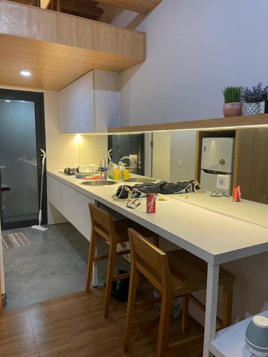 2 unit AC, kitchen set, bed lemari, meja makan, sofa, kulkas.