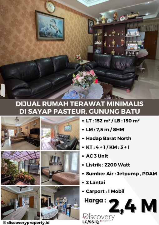Rumah keluarga di lokasi strategis Gunung Batu, Bandung. Dengan 4 KT dan 3 KM, LT 152m², LB 150m². Harga terbaik 2,4 Miliar. Dekat fasilitas publik.
