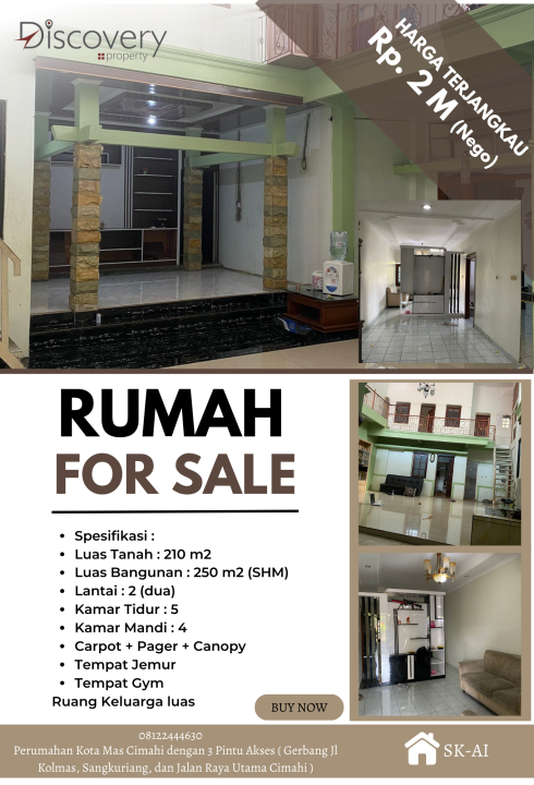 Rumah keluarga di lokasi strategis Cimahi Tengah, Cimahi. Punya KT dan KM, LT 210m², LB 250m². Harga terbaik 2,1 Miliar. Dekat fasilitas umum.