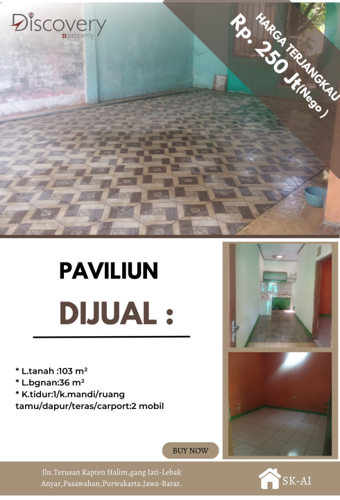 Rumah sederhana harga ekonomis di kawasan Pasawahan, Purwakarta. Memiliki 1 kamar tidur dan 1 kamar mandi. Luas tanah 103m² dan bangunan 36m². Proses mudah, harga 250 Juta.