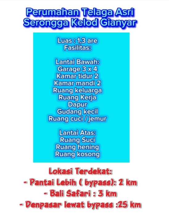 Rumah keluarga di lokasi strategis Gianyar, Gianyar. Dengan 2 KT dan 2 KM, LT 130m², LB 169m². Harga terbaik 900 Juta. Dekat fasilitas umum.