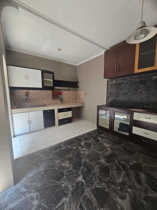 Layout ruang keluarga menyatu dengan ruang makan, memudahkan penataan interior sesuai kebutuhan. Area dapur sudah dilengkapi kabinet dan memiliki akses ke ruang terbuka.