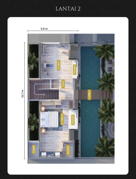 2. Type Gagar Mayang Luas Tanah: 582m2, Luas Bangunan: 477m2. Terdapat 5+2 Kamar Tidur & 5+2 kamar Mandi.