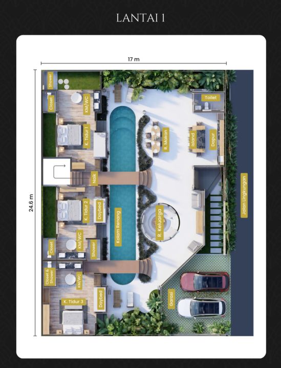 3. Type Juwita Ningrat Luas Tanah: 600m2, Luas Bangunan: 505m2. Terdapat 5+2 Kamar Tidur & 5+2 kamar Mandi.