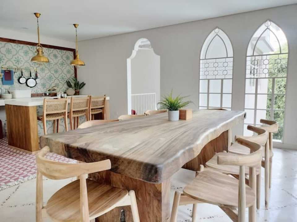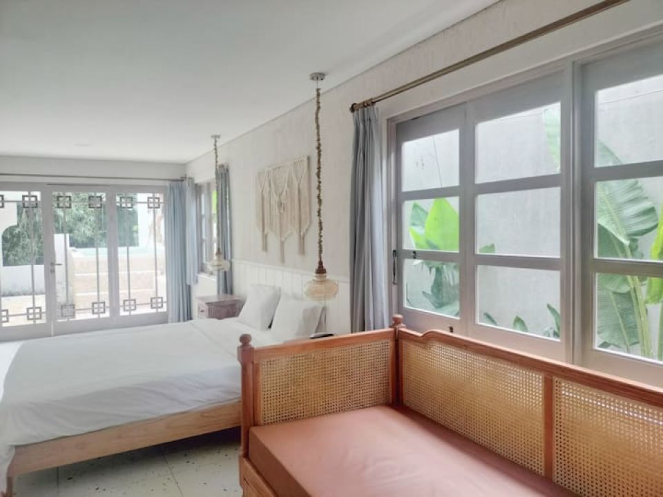 > Joi Sky (Lantai 2) : Kapasitas: 6 orang, 3 kamar tidur (4 ranjang 180x200, 2 ranjang 90x200 + mezanin), 2 kamar mandi, Jacuzzi air hangat