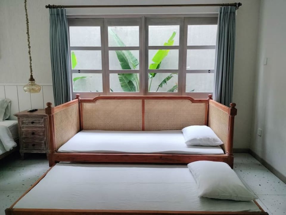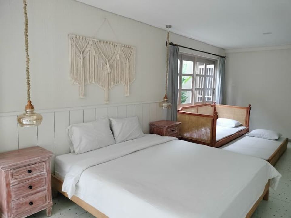 > Joi Roof (Lantai 2-3) : Kapasitas: 8 orang, 4 kamar tidur (4 ranjang 180x200, 2 ranjang 90x200, 1 sofa bed double), 2 kamar mandi + bathtub, Jacuzzi air hangat