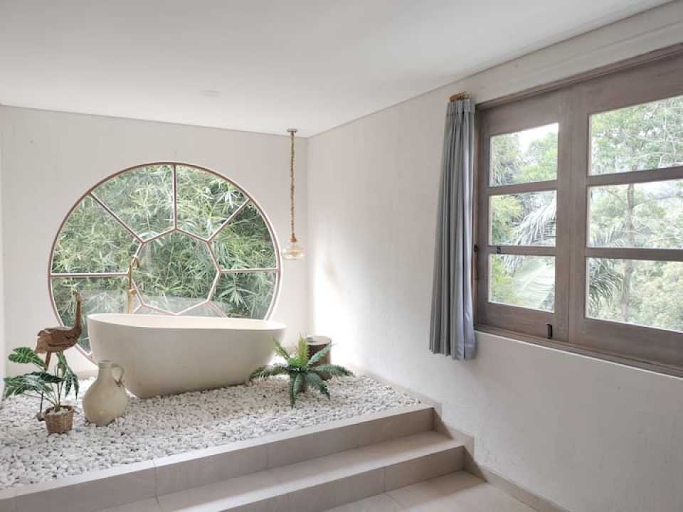 > Joi Home (Lantai 1-Basement) : Kapasitas: 6 orang, 3 kamar tidur (3 ranjang 180x200 + 1 sofa bed double), 3 kamar mandi, Kolam renang kaca air hangat + bathtub